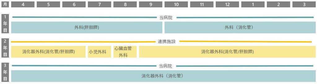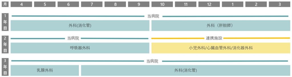 2018年度より外科専門医制度が改定され他院プログラムの連携施設として外科後期研修医の受け入れを行っていましたが、2020年度より当病院を基幹とした外科専門医プログラムを開始しました。独自のプログラムにより、個々の希望に添ったより自由度の高いプログラム設計が可能になっています。当病院プログラム所属の外科後期研修医のローテションスケジュール例を下図に示します。当院プログラムの連携施設では主に小児外科、血管外科症例を経験します。当院プログラムの連携施設の一覧を下表に示します。施設を厳選し相互連携としており、他プログラムに所属する同学年の後期研修医と交流する機会も多く、外科専門医取得のための良い刺激となります。