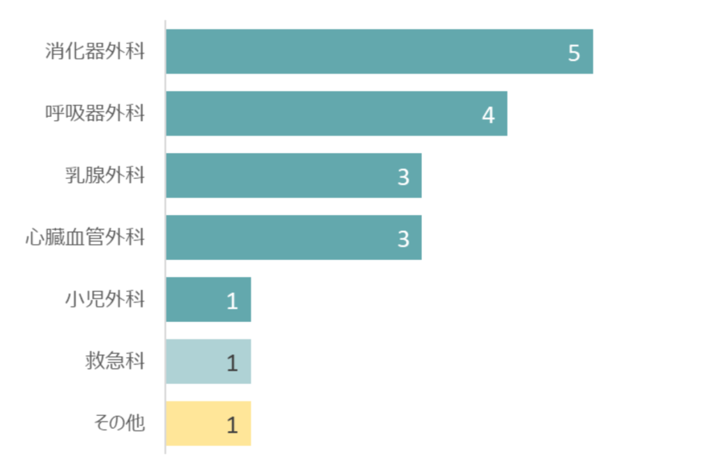 当病院では、大腸肛門外科、肝胆膵外科、甲状腺外科、呼吸器外科、乳腺外科、心臓血管外科の専門診療を行っています。各診療科とも沖縄県内で確かな治療実績があり、専門医が複数名常勤し沖縄県の外科治療をリードしてきました。(詳細は各科リンクをご参照ください。)後期研修医レベルの標準的な手術だけでなく高難易度な手術手技やその治療選択の過程を経験することで、外科専門医プログラム修了時の目標設定や修了後の進路選択が可能になります。大学医局と異なり様々な背景のサブスペシャルティー専門医が在籍しており、いつでも診療や進路に関して相談できる環境も当院プログラムの魅力の1つです。