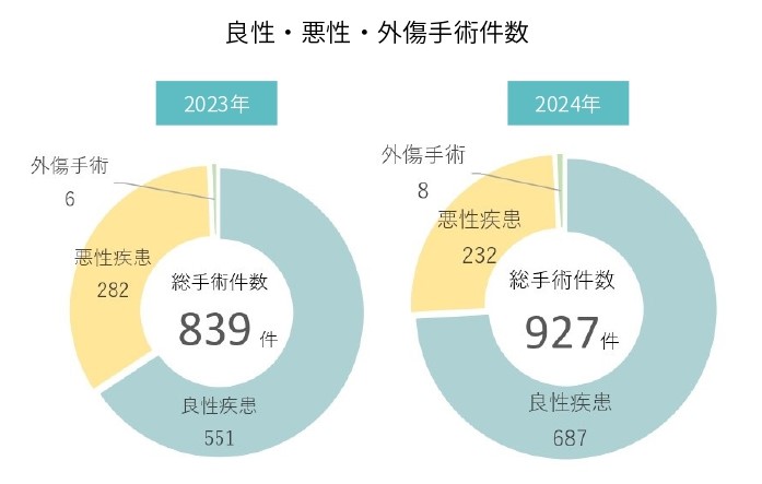 実際に当院での消化器外科手術症例のうち3/4が良性疾患の予定手術、1/4が悪性疾患の予定手術となっております。また全体の1/4が緊急臨時手術症例となっています。